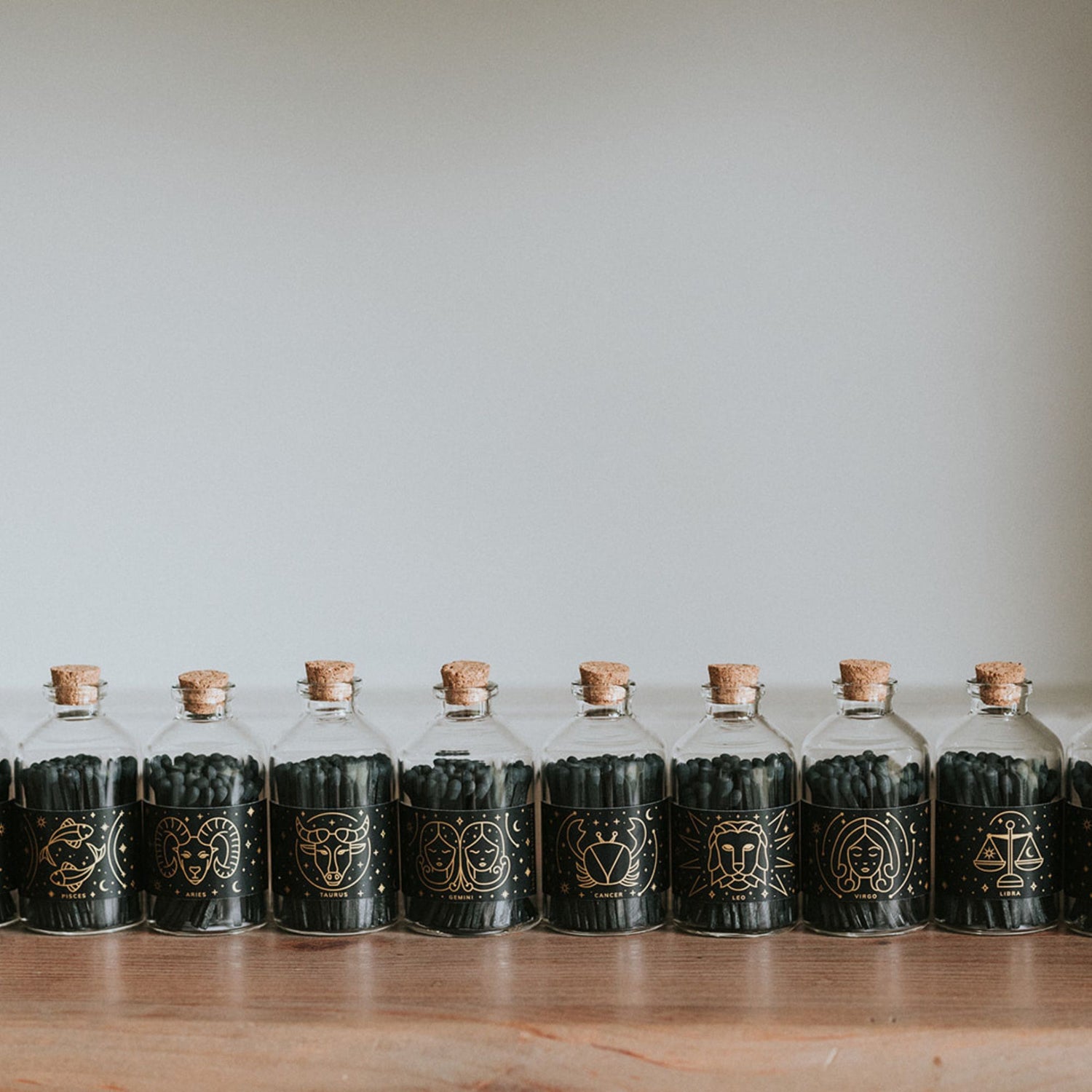Inspired by the twelve star signs. This collection features black monochrome matchsticks and gold artwork, ready to strike for a moonlight ritual.